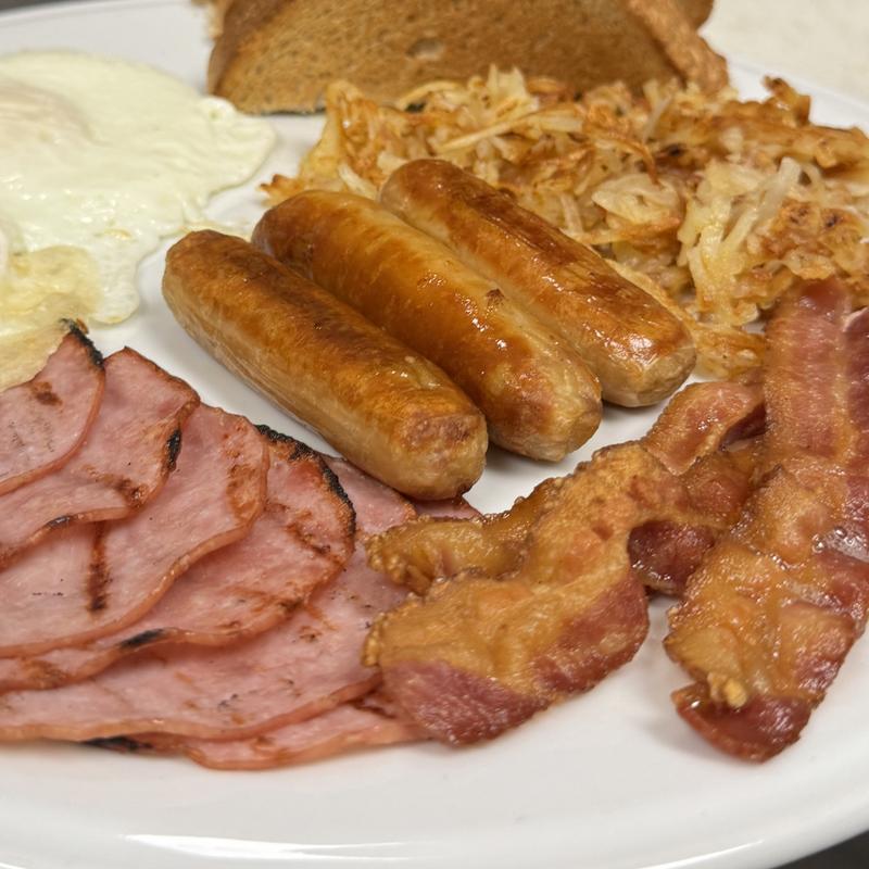 Ham, three sausage links, three bacon strips, and two eggs. Served with hash browns and toast.