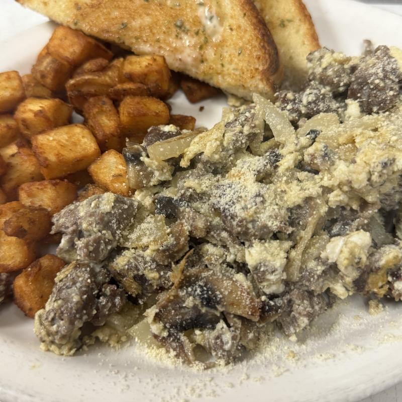 Two eggs scrambled with garlic, ground beef, onion, mushroom topped with parmesan cheese. Served with hash browns and garlic toast.